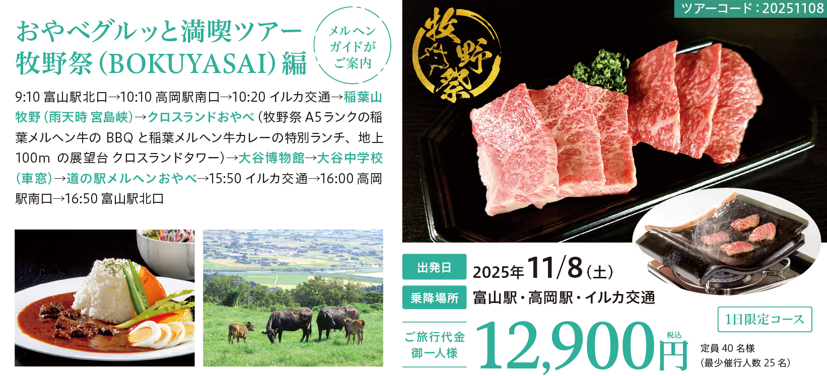 9:10 富山駅北口 → 10:10 高岡駅南口→ 10:20 イルカ交通バスターミナル→稲葉山牧野(雨天時 宮島峡)→ クロスランドおやべ(牧野祭 A5ランクの稲葉メルヘン牛のBBQと稲葉メルヘン牛カレーの特別ランチ、地上100mの展望台クロスランドタワー)→ 大谷博物館 → 大谷中学校(車窓)→ 道の駅メルヘンおやべ → 15:10 イルカ交通バスターミナル → 16:00 高岡駅南口 → 16:50 富山駅北口